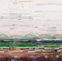 Fototapet cu design inspirat din tehnica colajului, compus din benzi orizontale în nuanțe pastel, naturale și accente verzi. Modelul sugerează un peisaj stilizat, cu un efect vizual cald și texturat.