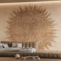 Acest fototapet impresionează prin designul său radial texturat, ce pare sculptat direct în material. Tonurile calde de bej conferă senzația unui spațiu solar și calm, ideal pentru zonele de relaxare precum livingul sau dormitorul.
