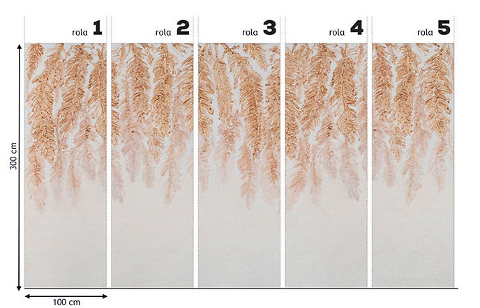 Piuma este o reinterpretare artistică a motivului decorativ cu puf sau frunze căzătoare, realizat în nuanțe de cupru și auriu pe un fundal alb cald. Designul delicat și elegant inspiră rafinament, păstrând totodată o estetică aerisită. Structura desenului manual și aspectul texturat adaugă o notă sofisticată oricărui spațiu.