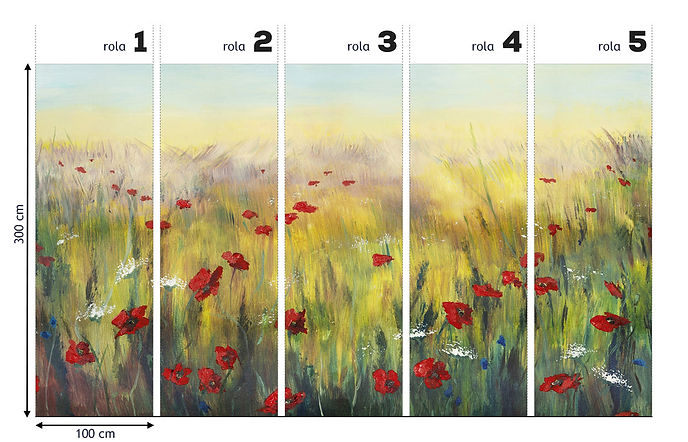 Poppy este un fototapet pictural, ce surprinde frumusețea unei pajiști de vară în culori vibrante și texturi fluide. Roșul aprins al macilor se îmbină armonios cu verdele intens al ierburilor și tonuri de galben cald, creând un efect optimist și reconfortant.