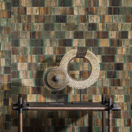 Acest model este realizat din fibre naturale de bakbak – frunzele exterioare ale palmierului de abaca – atent uscate, vopsite și împletite manual într-un design mozaicat spectaculos. Textura fibrelor evidențiază variațiile organice ale materialului, oferind un tapet decorativ autentic, cu un aer exotic și natural. Tapetul din bakbak este apreciat pentru durabilitatea sa, rezistența la umiditate și aspectul său artizanal, fiind ideal pentru spații care caută un echilibru între naturalețe și expresivitate.