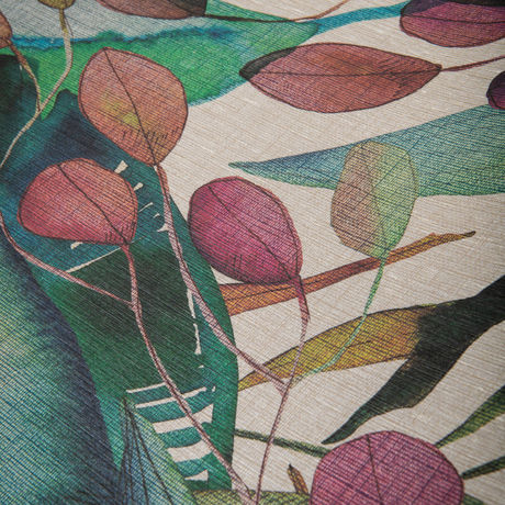 În această variantă, tapetul Abundance capătă o energie proaspătă și luxuriantă, cu frunze pictate în nuanțe de verde profund, burgundy și galben-auriu. Imprimeul amplu este aplicat pe o țesătură de in natural, păstrând textura autentică a fibrei. Este un model ideal pentru interioare moderne sau eclectice, care caută legătura cu natura fără a renunța la rafinament.