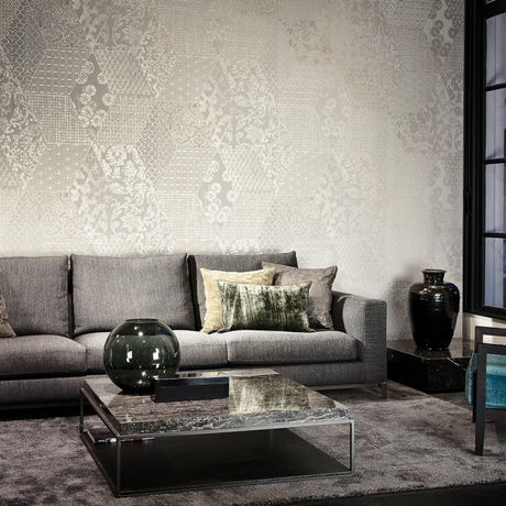 Acest tapet tip patchwork aduce laolaltă o colecție sofisticată de imprimeuri în relief, formând un colaj elegant și discret. Textura subtilă și geometria rafinată a modelului creează un efect vizual bogat, fără a încărca spațiul. Fiecare hexagon are propria sa poveste vizuală, contribuind la o atmosferă aparte în orice interior.